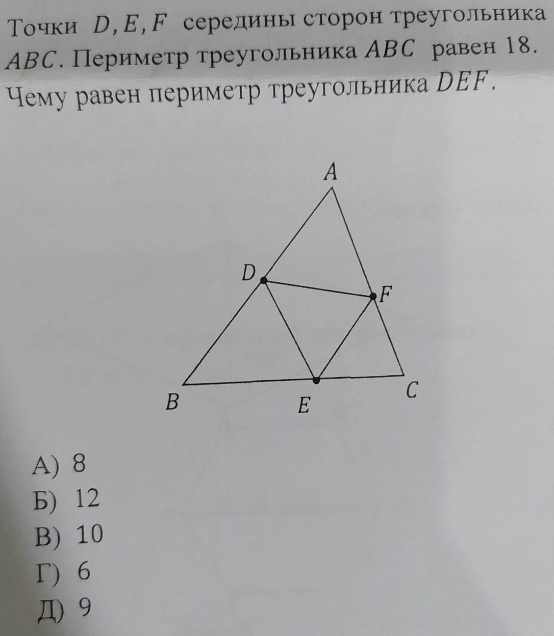 P=DF+EF+DE=BC/2+AB/2+AC/2=(AB+AC+CB)/2=Pabc/2=18/2=9