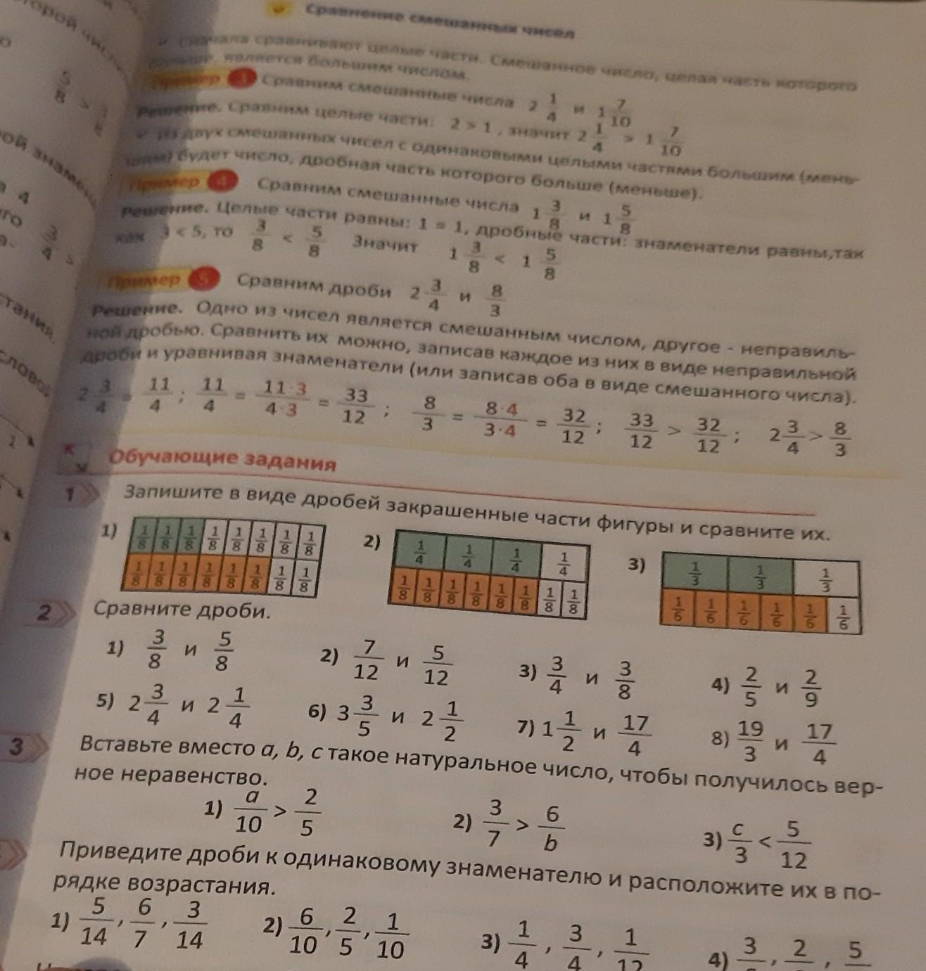 5)2 3/4>2 1/4; 6)3 3/5>2 1/2; 7)1 1/2<17/4=4 1/4; 8)19/3=6 1/3>17/4=4 1/4.