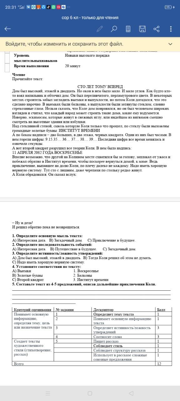 Прогуляюсь в будущем и вернусь обратно. После этого Коля очень долго ходил по улицам города будущего и рассматривал новейшие и невиданные изобретения человечества. Он так увлекся, что даже забылся, но всё же решил вернуться в институт будущего. Когда Коля вернулся домой и стал рассказывать семье о том месте, где он побывал ему никто не верил, и ему оставалось только вспоминать увиденное в этот чудесный день.