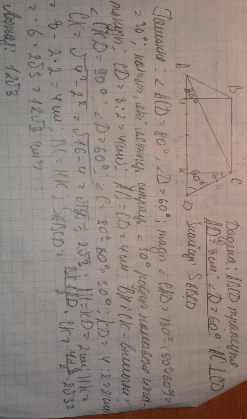 решите задачу с решением. В равнобедренной трапеции диагональ перпендикулярна боковой стороне. Найдите площадь трапеции, если большее основание равно 8, а один из углов трапеции равен 60.