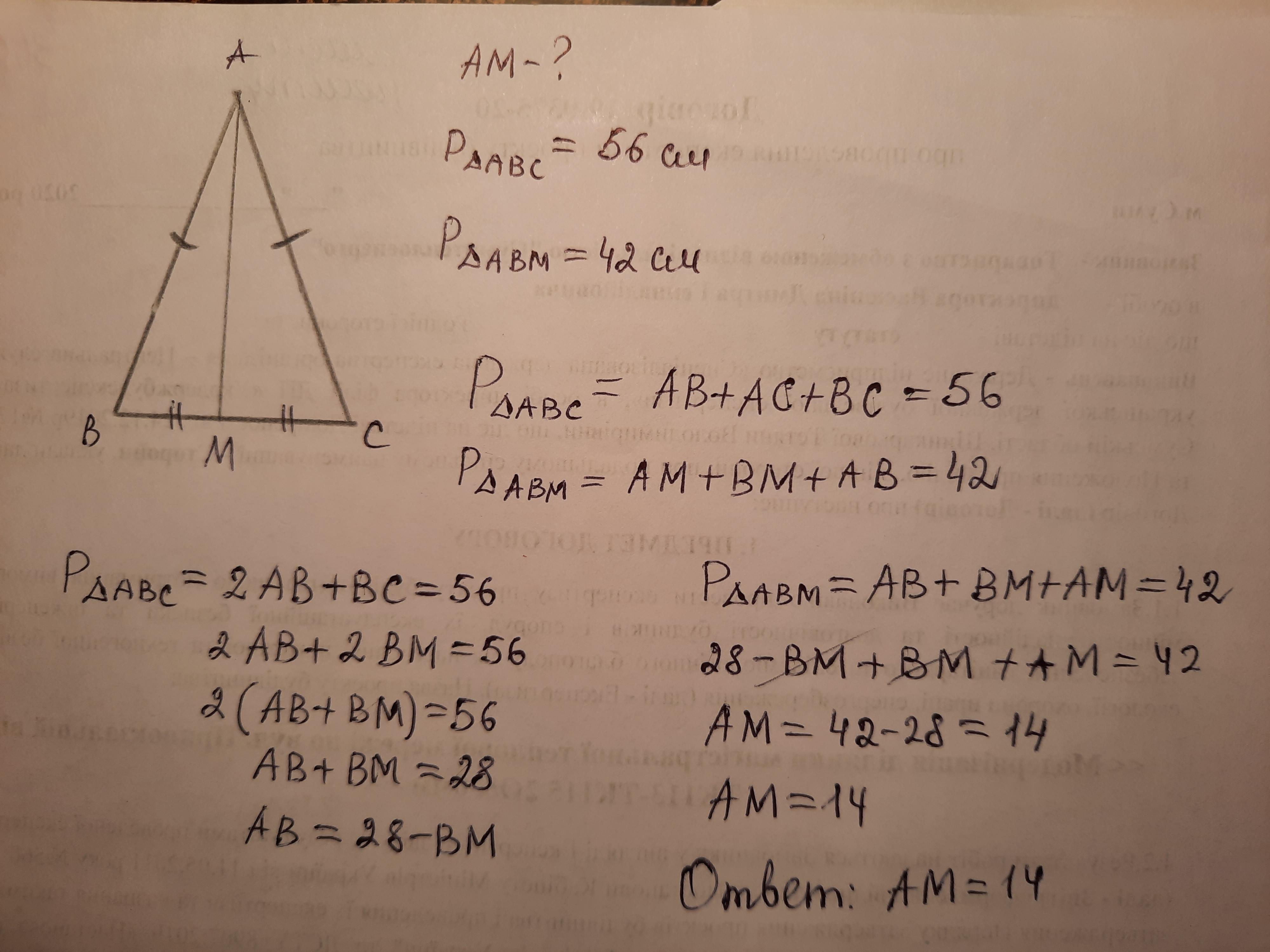 помогите срочно бам 60 балловв равнобедренном треугольнике ABC с основанием BC проведена медиана am Найдите медиану am если периметр треугольника ABC равен 56 а периметр треугольника ABM равен 42 см