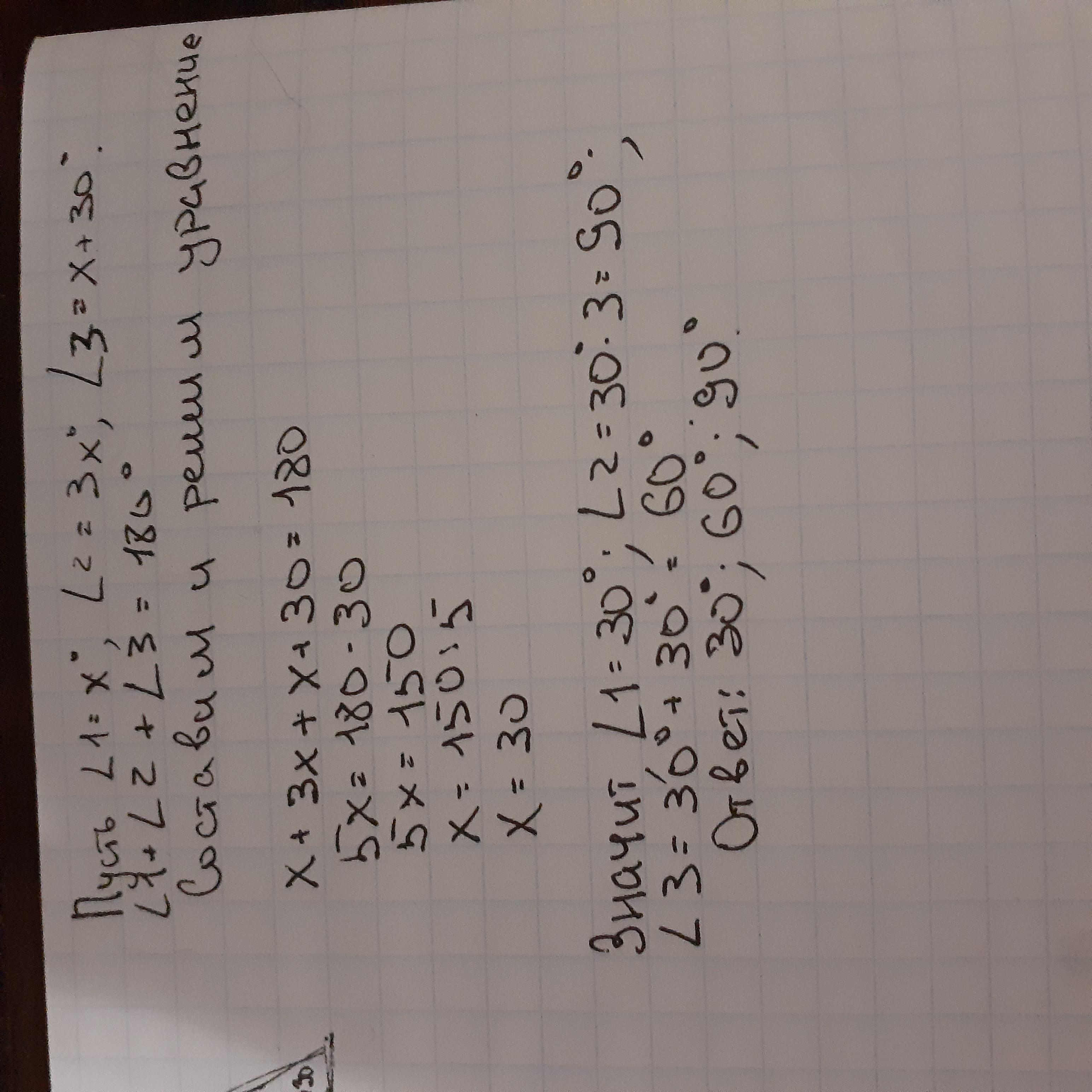 Найдите углы треугольника если один из них в 3 раза меньше другого и на 30 градусов больше третьего. С объяснением