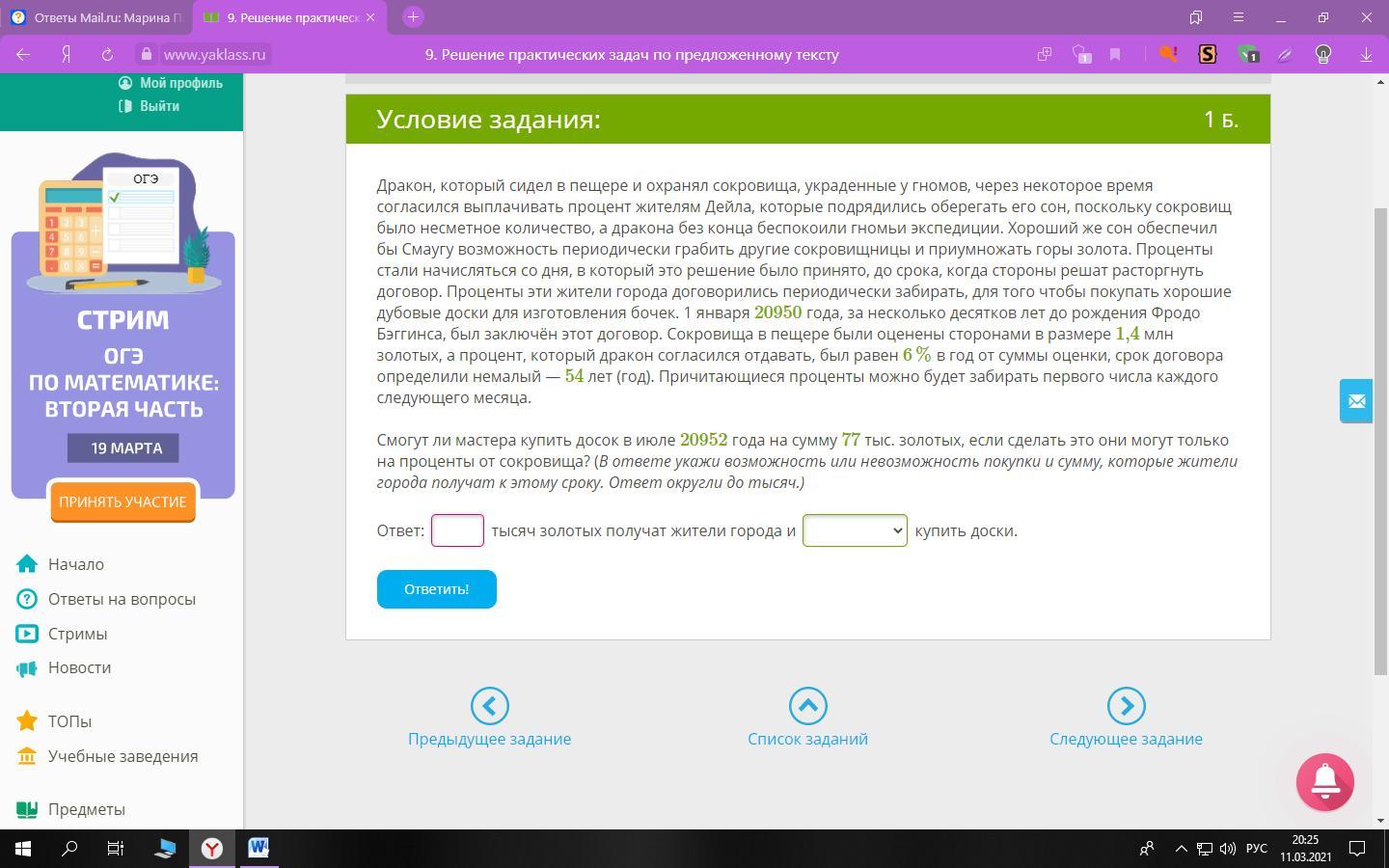 Смогут ли мастера купить досок в июле 20952 года на сумму 77 тыс. золотых, если сделать это они могут только на проценты от сокровища? (В ответе укажи возможность или невозможность покупки и сумму, которые жители города получат к этому сроку. Ответ округли до тысяч.)