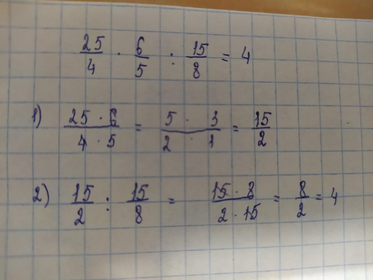 Чтобы было понятнее, я разбила пример на 2 действия, вначале умножаем дроби сокращая, как показано на фото. Затем делим, помня,что при делении дробь переворачиваем. На фото будет выглядеть понятнее