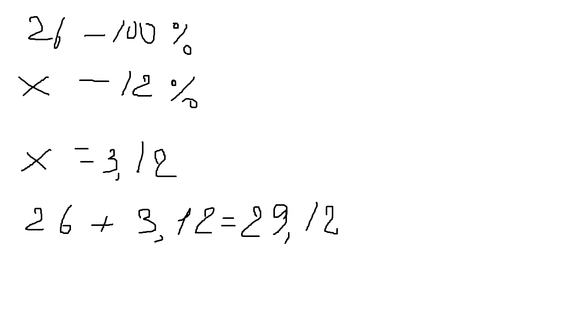 26•12/100=3,12 цена увеличится на эту сумму. 26+3,12=29,12 новая цена