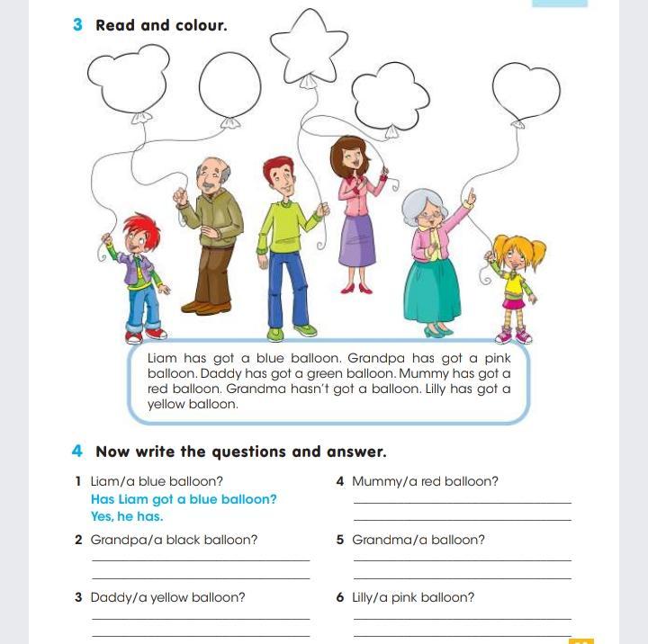 2 has grandpa got a black balloon? no, he hasnt 3 has daddy got a yellow balloon? no, he hasnt. 4 has mummy got a red balloon? yes, she has. 5 has grandma got a balloon? no, she hasnt. 6 has Llly got a pink balloon? no, she hasnt