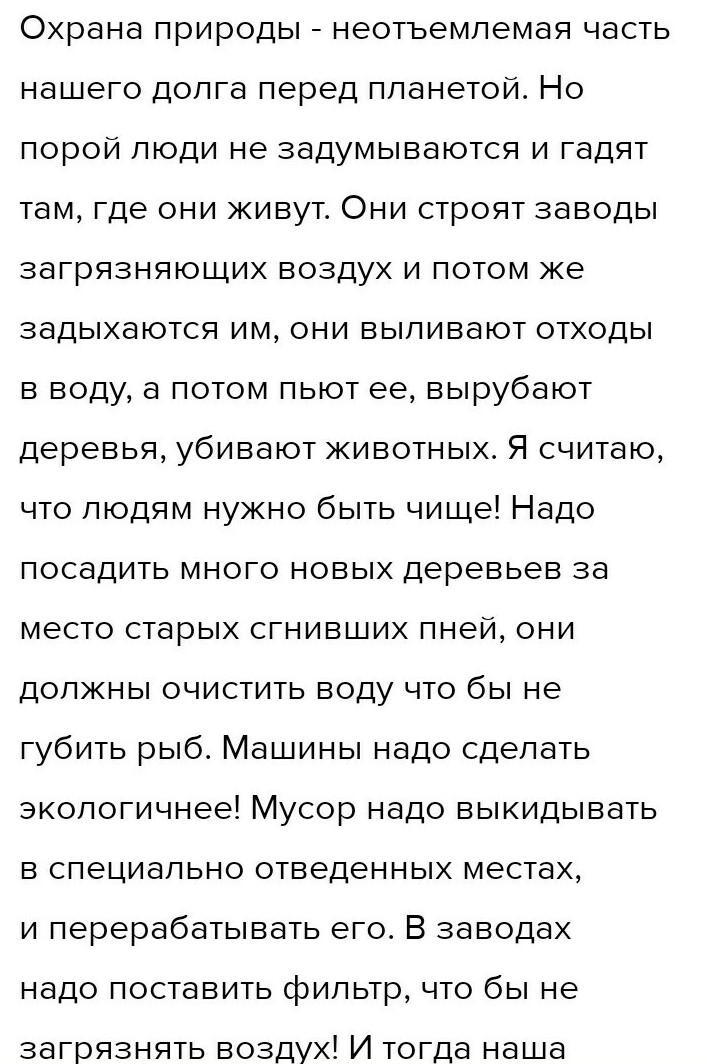 Охрана природы - неотъемлемая часть нашего долга перед планетой. Но порой люди не задумываются и гадят там, где они живут. Они строят заводы загрязняющих воздух и потом же задыхаются им, они выливают отходы в воду, а потом пьют ее, вырубают деревья, убивают животных. Я считаю, что людям нужно быть чище! Надо посадить много новых деревьев за место старых сгнивших пней, они должны очистить воду что бы не губить рыб. Машины надо сделать экологичнее! Мусор надо выкидывать в специально отведенных местах, и перерабатывать его. В заводах надо поставить фильтр, что бы не загрязнять воздух! И тогда наша планета будет развиваться в лучшую сторону и люди начнут благодарить предков, за то что они вовремя опомнились.