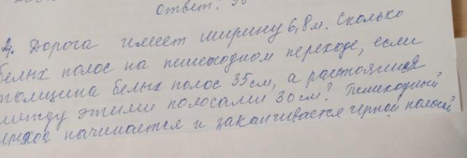 Дорога имеет ширину 6,8 м. Сколько белых полос на пешеходном переходе, если толщина белых полос 35 см, а расстояния между этими полосами 30 см? Пешеходный переход начинается и заканчивается черной полосой