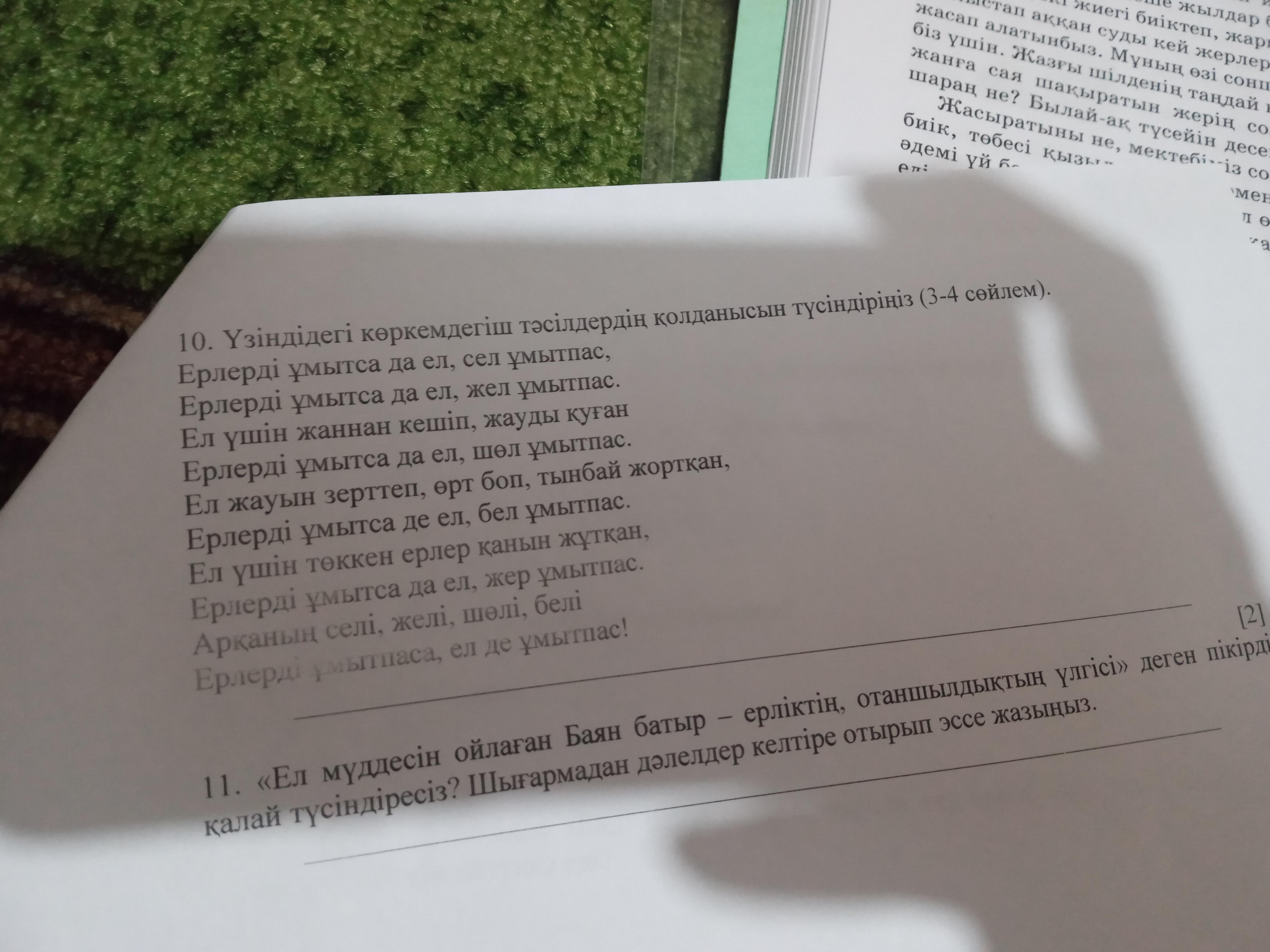 бұл үзіндіде ассонанс қолданылған. өлең сөзде дауысты дыбыстардың үндесе қайталануы. Ассонанс сөздің интонация-музыка мәнін, экспрессивтік-эмоционалдық бояуын күшейтіп, ерекше елеулі тұстарды дыбыстандырып, ой-сезімнің әсерлілігін арттырады