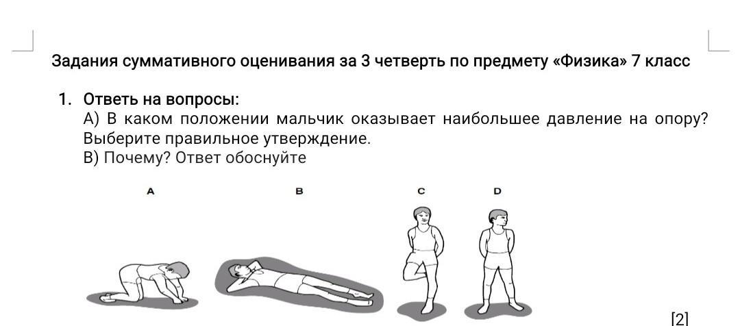 А) В каком положении мальчик оказывает наибольшее давление на опору? Выберите правильное утверждение.
