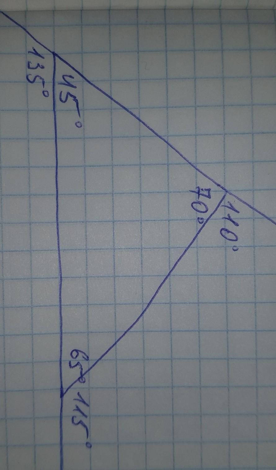 Тк 2 внутрішні кути трикутника дорівнююсь 45° та 70°, то третій внутрішній кут буде дорівнювати 65°. Зовнішній кут при куті 65° буде дорівнювати 115°. Зовнішній кут при куті 70° буде дорівнювати 110°, й останній зовн. кут при куті 45° буде дорівнювати 135°.