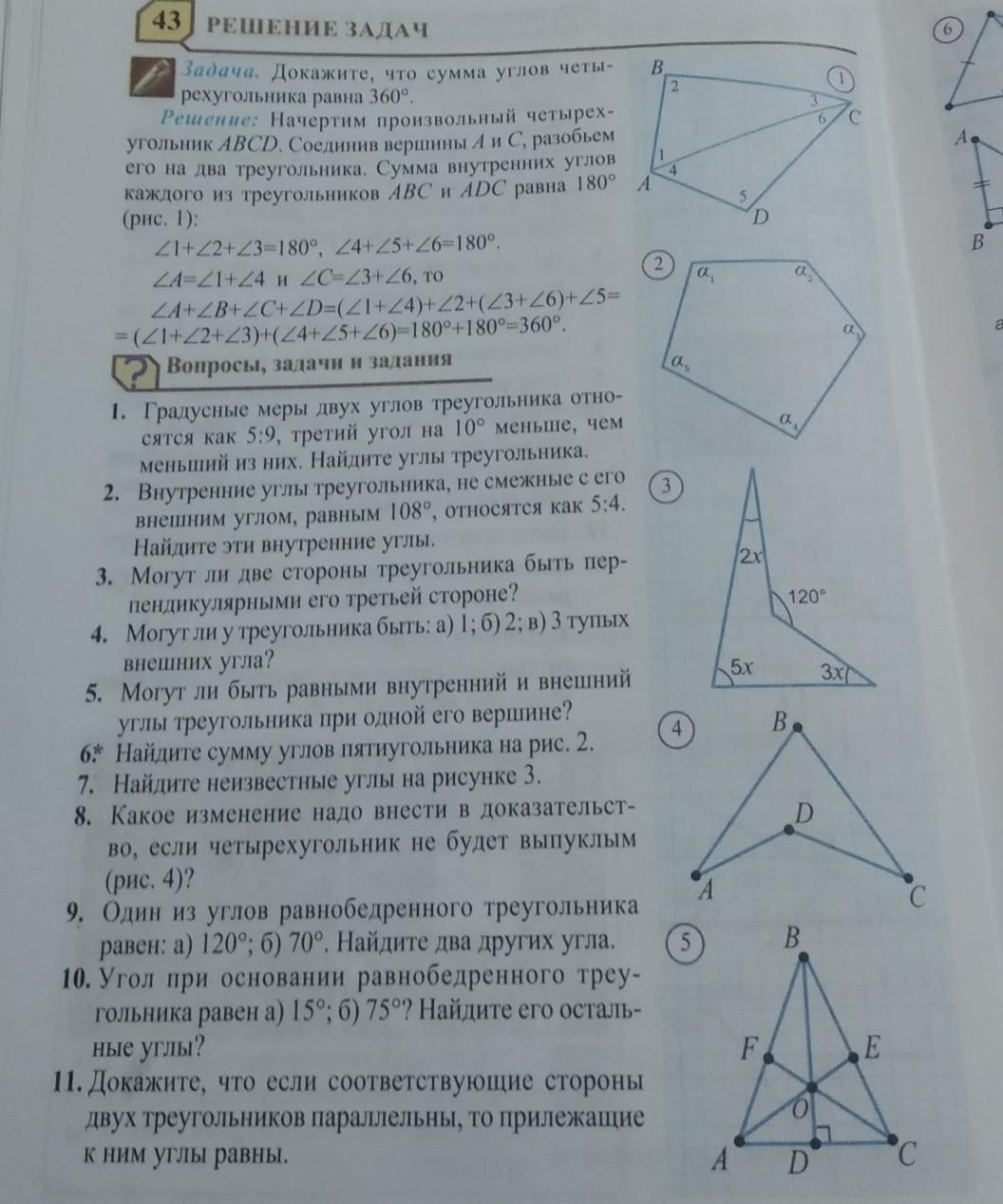 6. 180° · 3 = 540° (решение аналогично задаче в самом верху страницы учебника, только треугольников будет 3, а не 2; рис. 2).