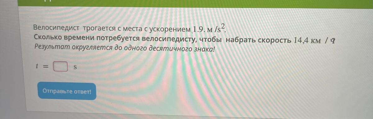 t=(v-vo)/a=(4-0)/1.9=2.1 с