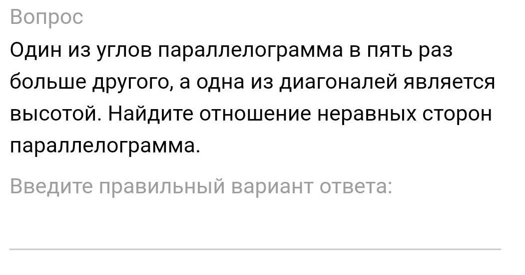 Один из углов параллелограмма в пять раз больше другого, а одна из диагоналей является высотой. Найдите отношение неравных сторон параллелограмма.