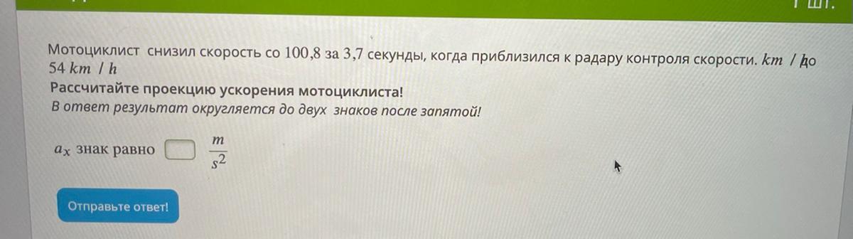 a=(v-vo)/t=(15-28)/3.7= -3.51 м/с²