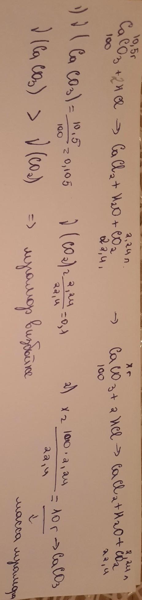 при действии на мрамор массой 10,5 г соляной кислоты выделился оксид углерода(4) объемом 2,24 л (н.у.).Определите массовую долю карбоната кальция в мраморе