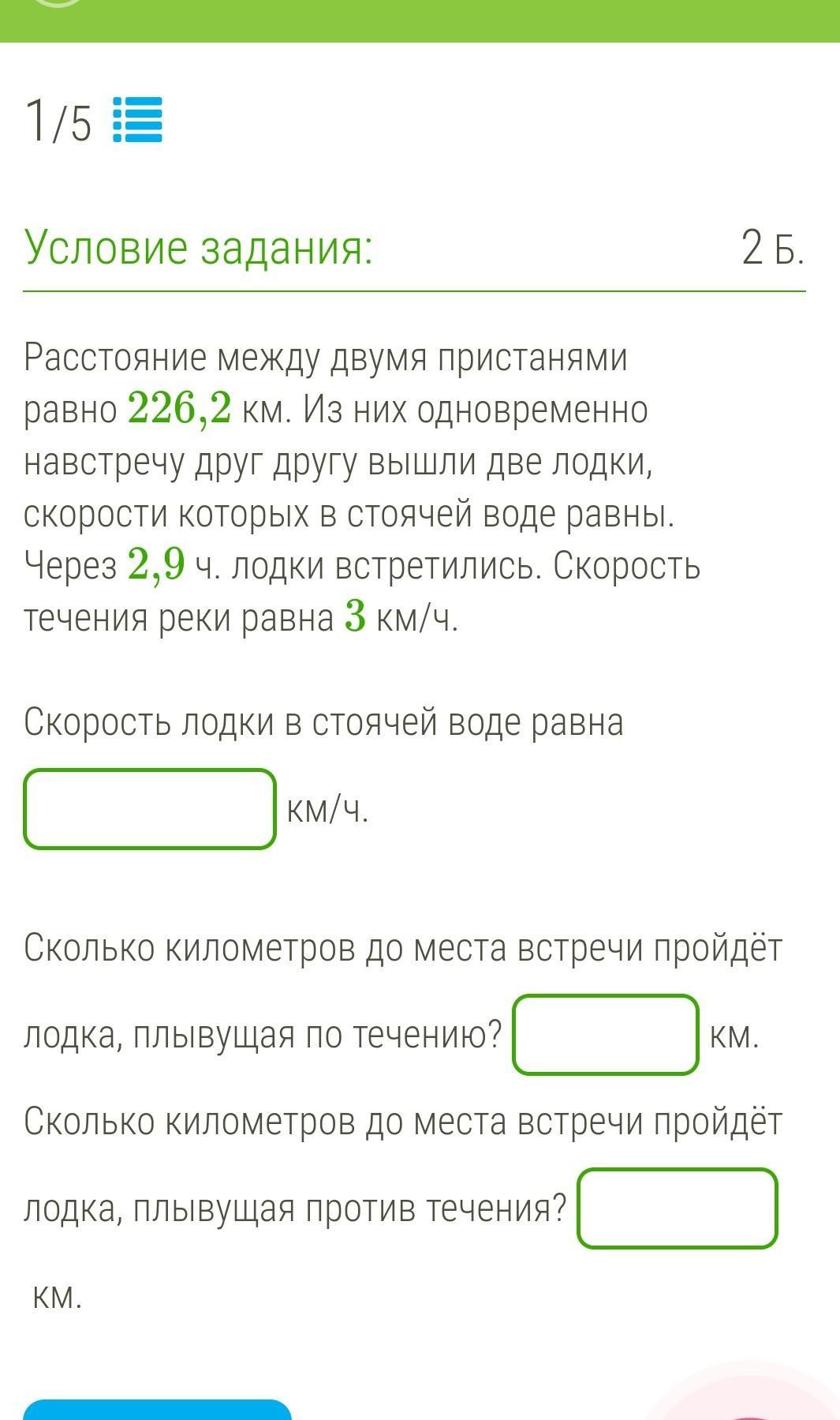 Расстояние между двумя пристанями равно 226,2 км. Из них одновременно навстречу друг другу вышли две лодки, скорости которых в стоячей воде равны. Через 2,9 ч. лодки встретились. Скорость течения реки равна 3 км/ч.