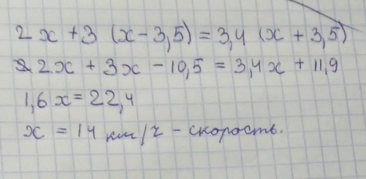 Катер за 2 часа по озеру и за 3 часа против течения реки проплывает такое же расстояние, что за 3,4 часов по течению реки. Найдите собственную скорость катера, если скорость течения реки равна 3,5 км ч