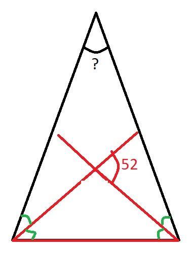 < = (180-52) - угол при вершине угол при основании биссектрис 52 : 2 = 26, следовательно угол при основании в искомом треугольнике будет = 52 т.к. биссектрисы делят угол пополам. угол при вершине равен 180 - 2* 52 = 76