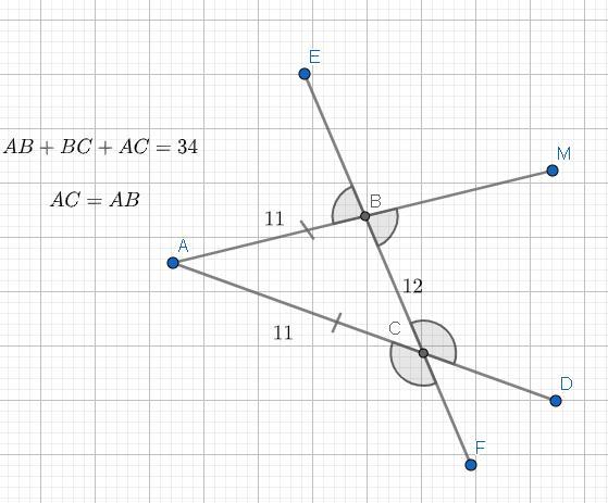 Так как 2 внешних угла треугольника ABC друг другу равны(<CBM == <ACF), то вторая пара соседних вертикальных внешних углов тоже равна (<ABC == <ACB (рис.1)).