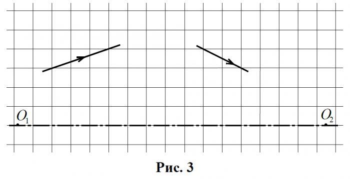 На рис.представлены: главная оптическая ось тонкой линзы О1 О2 и фрагменты хода луча до линзы и после. Масштаб: 1 клетка – `5`см. Определите, какая это линза собирающая или рассеивающая, а также её оптическую силу? Представьте рисунок.
