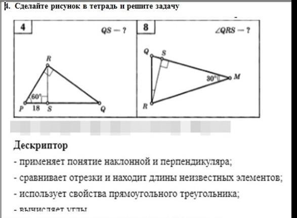 Смотрите, нам дан прямоугольный треугольник с прямым углом R и P= 60, тогда Q=30 RS -высота, которая делит треугольник на еще 2 прямоугольных с прямыми углами при S. А теперь заметим кое-что.