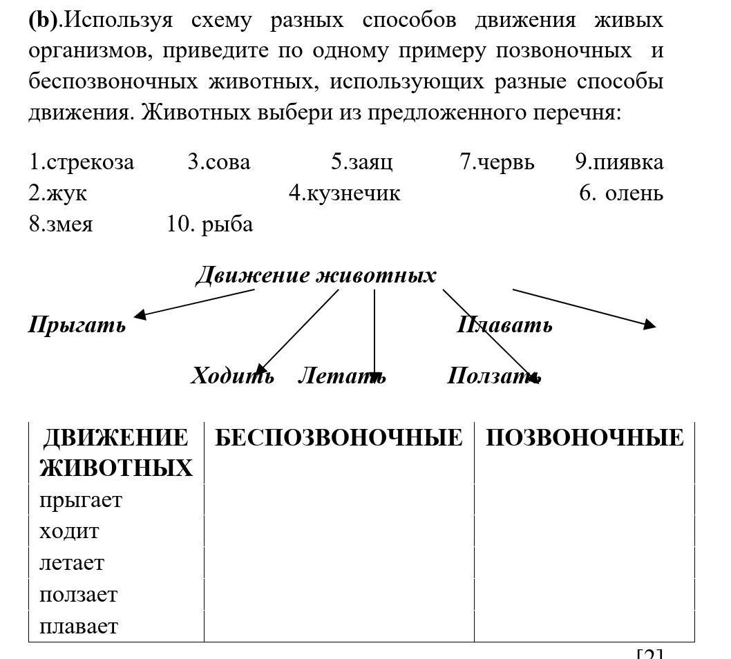 Используя схему разных способов движения живых организмов, приведите по одному примеру позвоночных и беспозвоночных животных, использующих разные способы движения. Животных выбери из предложенного перечня: