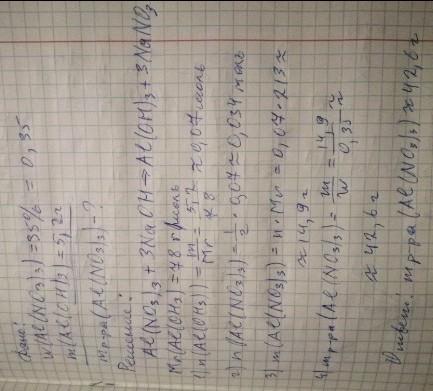 Решите задачу. Определите массу раствора нитрата алюминия с массовой долей растворенного вещества 35%, необходимого для получения гидроксида алюминия массой 5,2 г.
