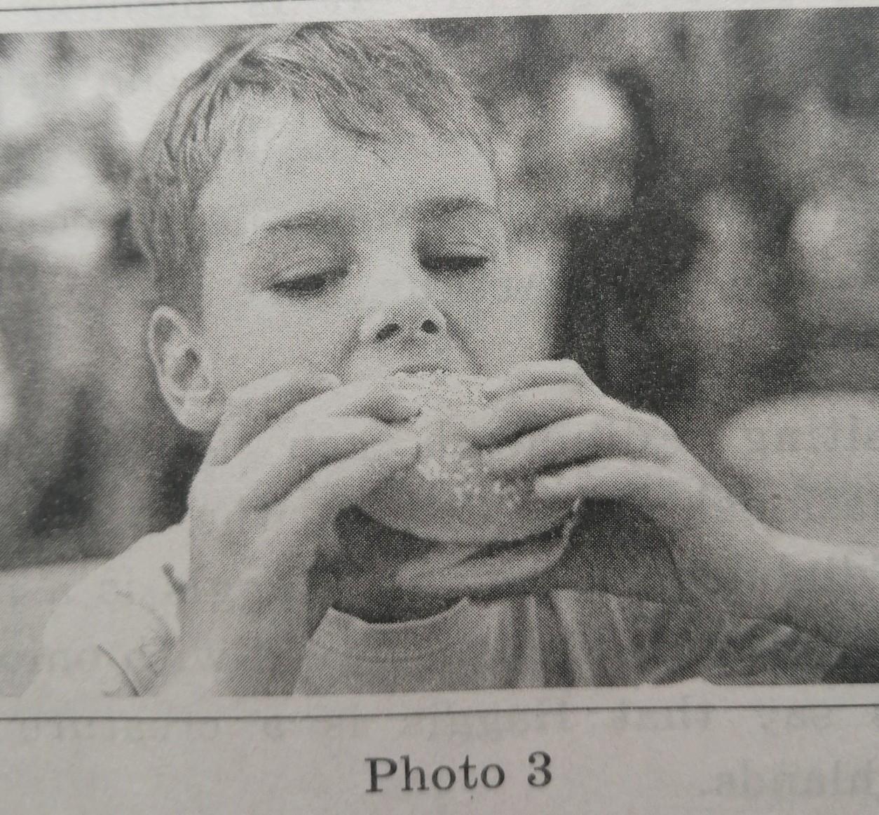 picture number three on it izabrazhen boy who is in the park or on the street .He's eating a burger.I like this picture it is not very bright more precisely black and white.