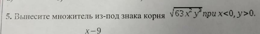 63=7*9... корень из 9 извлечется, из 7 останется... корень из (х^2)=|х| (модуль икс) и при отрицательном значении икс будет корень из (х^2)=-х (знак "минус" компенсирует отрицательность переменной... т.к. арифметический квадратный корень (по определению) не может быть числом отрицательным... Ответ: ...= -3ху*V(7y)