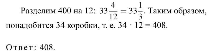 Гелевые ручки продаются в коробках по 12 штук в каждой. Нужно купить наименьшее возможное число коробок, но так, чтобы в них было не менее 400 ручек. Сколько ручек было куплено?