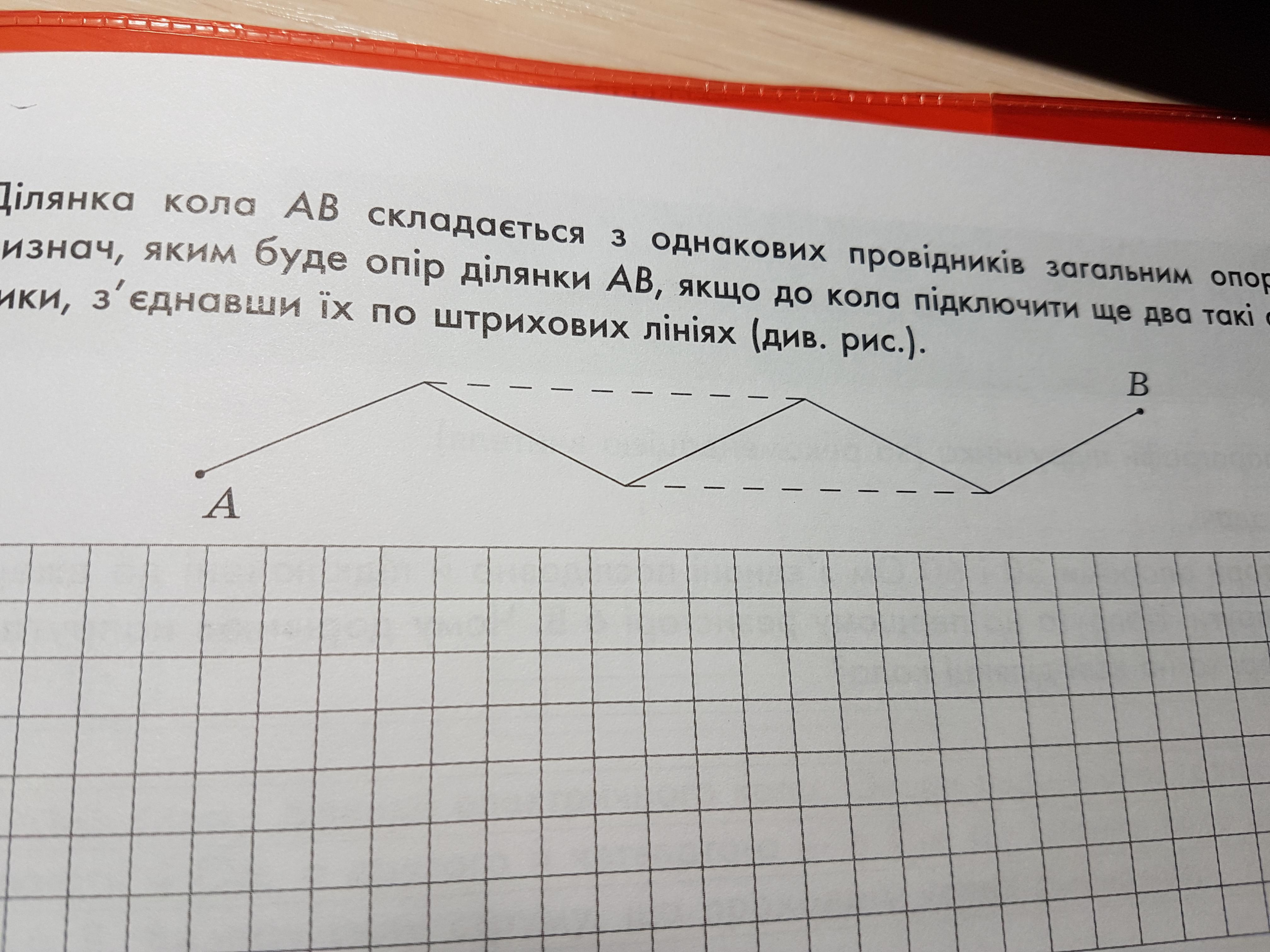 Ділянка кола AB складається з однакових провідників загальним опором 5 ом. Визначте, яким буде опір ділянки AB, якщо до кола підключити ще два такі самі провідники, з'єднавши їх по штрихових лініях