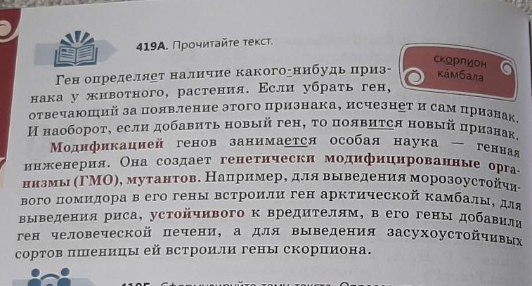 419В. Что такое генетически модифицированный / измененный организм, или мутант? Приведите примеры. Подберите синонимы к словам модифицировать, добавить (ген). Определите типы значений глаголов (прямое,переносное) встроить (ген) ,пересадить (ген).