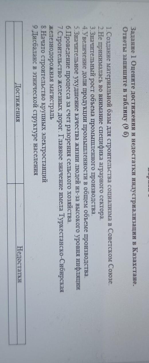Оцените достижения и недостатки индустриализации в Казахстане. Ответы запишите в таблицу.
