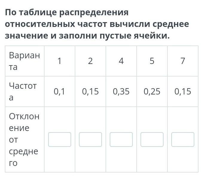 По таблице распределения относительных частот вычисли среднее значение и заполни пустые ячейки.