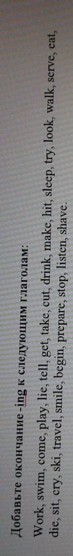 Working, swimming, coming, playing, lying, telling, getting, taking, cutting, drinking, making, hitting, sleeping, trying, looking, walking, serving, eating, dying, sitting, crying, skiing, traveling, smiling, beginning, preparing, stopping, listening,shaving