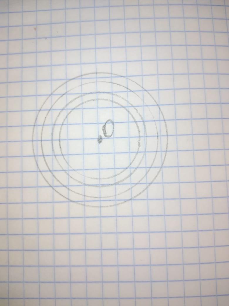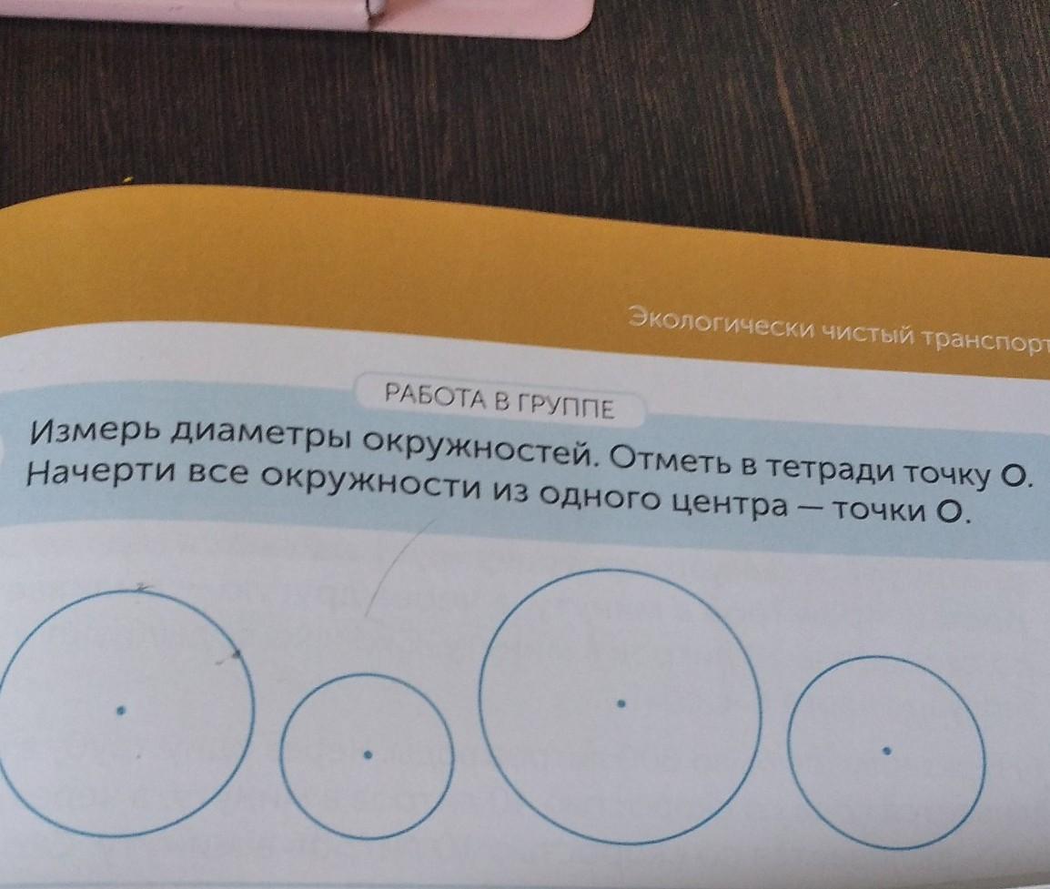 Измерь диаметры окружностей. Отметь в тетради точку о.