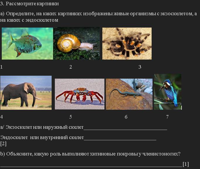 а) Определите, на каких картинках изображены живые организмы с экзоскелетом, а на каких с эндоскелетом