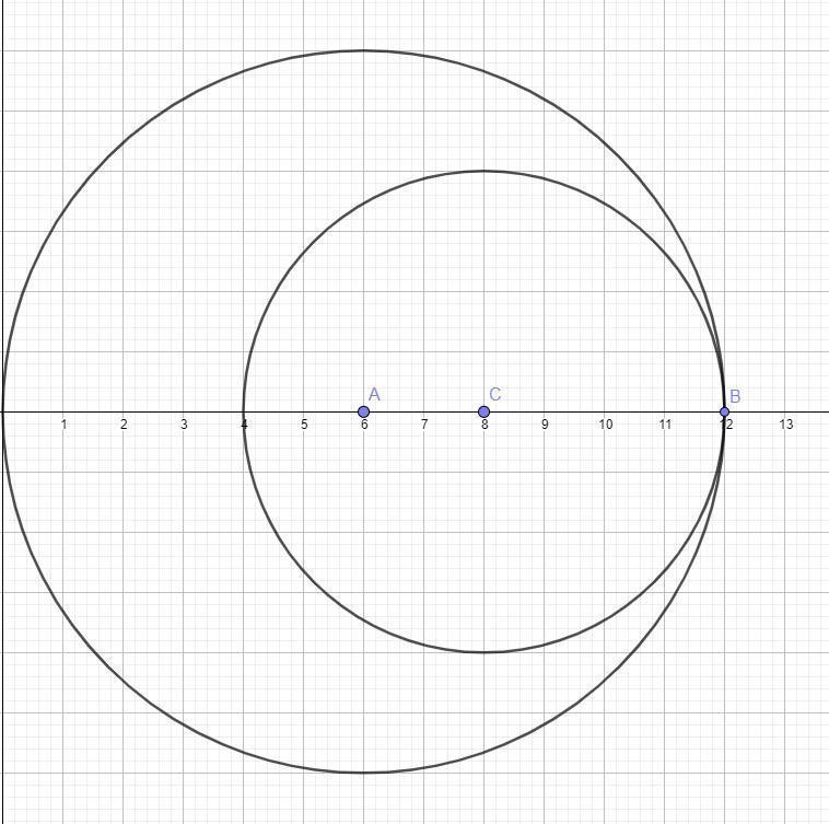 По рисунку видим, что отрезок AB является диаметром бо́льшей окружности, а отрезок BC является радиусом ме́ньшей окружности.
