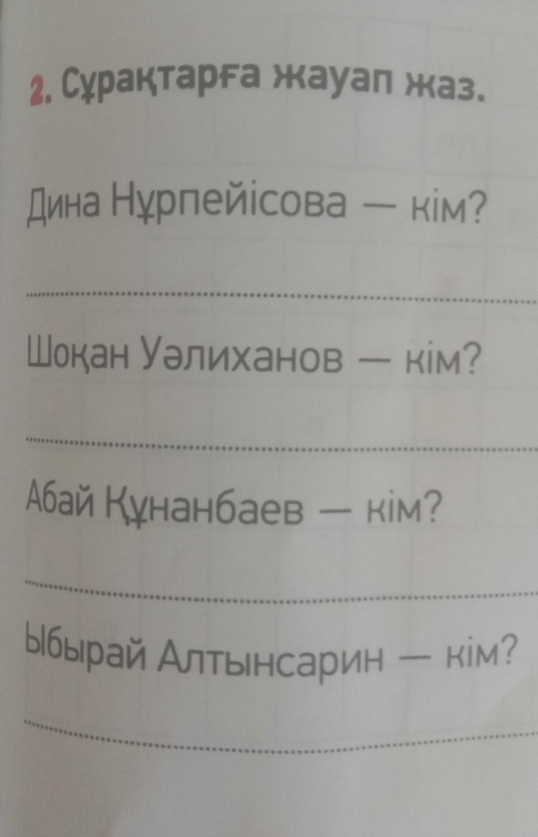 2. Сұрақтарға жауап жаз . Дина Нұрпейісова - кім ? Шоқан Уәлиханов - кім ? Абай Құнанбаев – кім ? Ыбырай Алтынсарин - кім ?