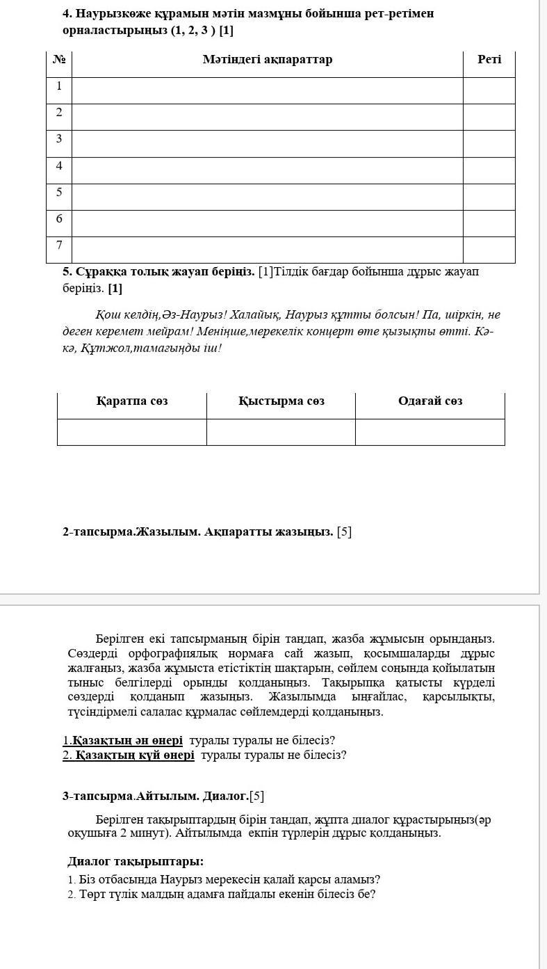 Табиғат бастауы су ғой. Сусыз тіршілік болмас. Сондықтан Наурызкөженің де негізі су болып табылады.Қазақтың ең жақсы көретін, негізгі ас дәмдерінің бірі – ет. Қашанда қазақы дастарханның берекесін ет келтіреді. Сол себепті Наурызкөжеге қазақтың төл асы – ет қосылады. Көжеге үшінші - дәм арпаны қосады. Арпаның емдік қасиеті жайлы бәріне белгілі. Арпаны жиі пайдаланатындардың қаны бұзылмайды дейді білгіштер. Ирак тәуіптері бұл дәнді «ғажап құтты дән» деп атаған. Көптеген ауруларға шипалы. Сонымен қатар тойымды болып келеді. Арпамен қоса, тары, күріш сияқты дәнді дақылдар қосылады. Жалпы, Наурызкөжеге дәнді дақыл қосудың бір мағынасы – бір тамырдан өсіп-өнген дәндей ұрпағымыз көп болсын деген тілек болса керек. Көжеге міндетті түрде айран немесе ақ құяды. Бұның да негізінде – сүттей ұйып отырайық, ақ мол болсын деген ниет жатқан болар. Қазақтың ұлттық тағамдарына кіретін құрт та көженің дәмін келтіріп, ерекшелендіреді.Кез-келген тағамның дәмін тұз келтіреді. Наурызкөжеге де дәм беретін тұз жетінші тағам ретінде қосылады. пожалуйста помогите дам 30 баллов