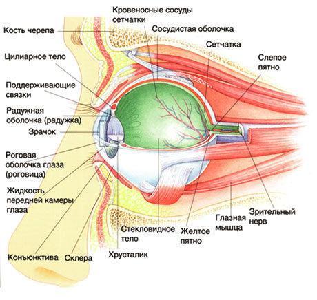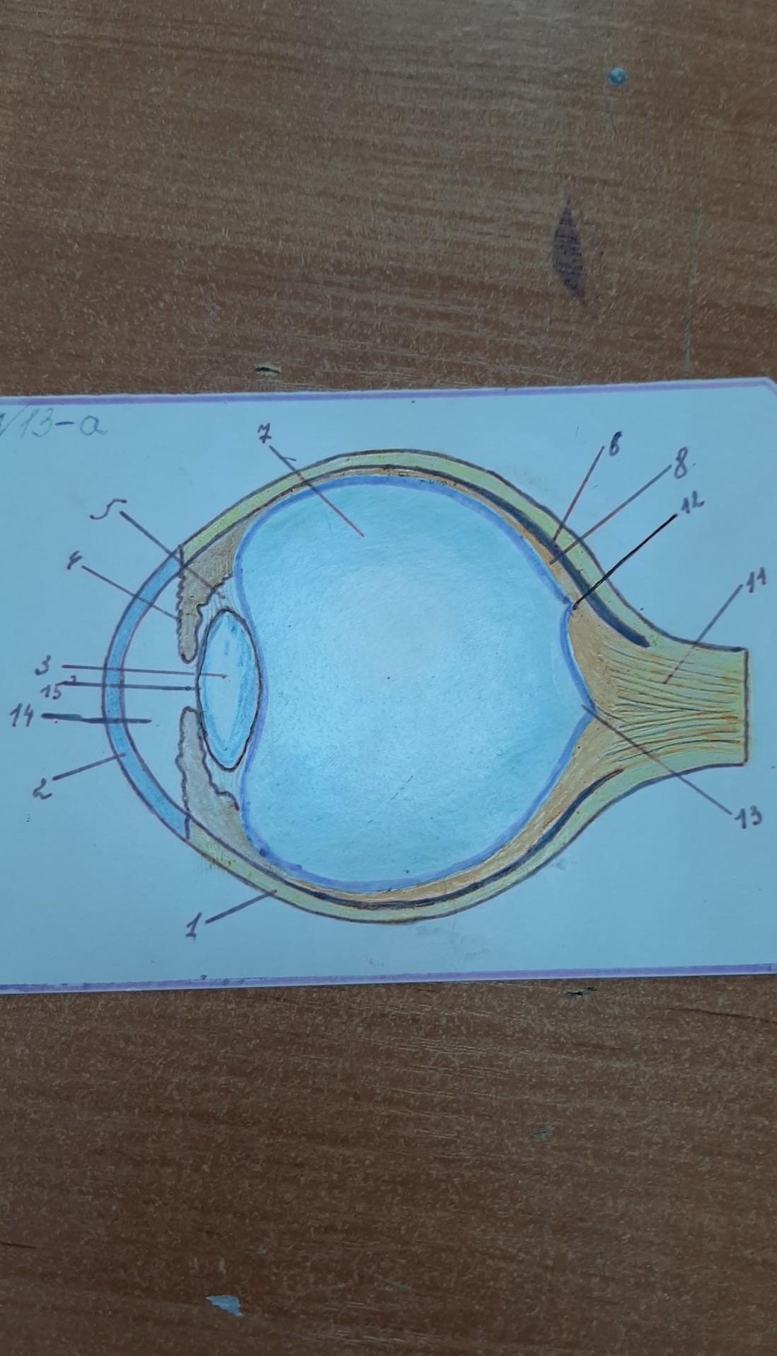 1-Сосудистая оболочка, 2-роговица,3-хрусталик,4-радужка, 5-зрачок, 6-склера,7-стекловидное тело,8-сетчатка,9(агде),10(агде),11-зрительный нерв,12-центральная ямка,13-слепое пятно, 14-водянистая влага, 15(зрачок?)