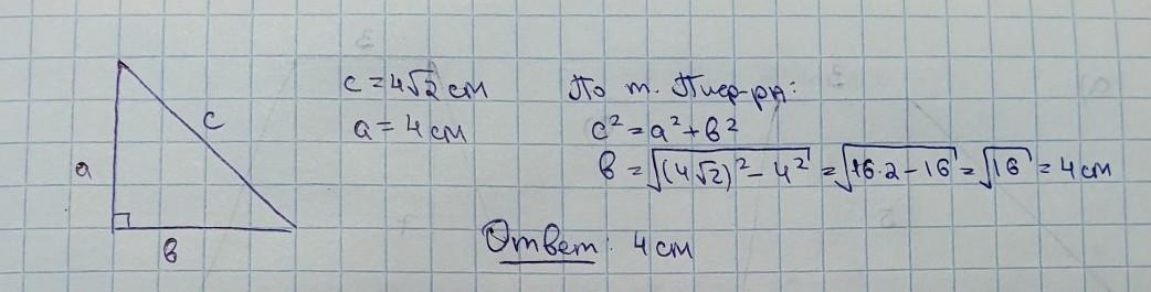 у прямокутному трикутнику гіпотенуза дорівнює 4корінь2 см, а один із катетів дорівнює 4см. знайдіть другий катет і гострі кути трикутника.