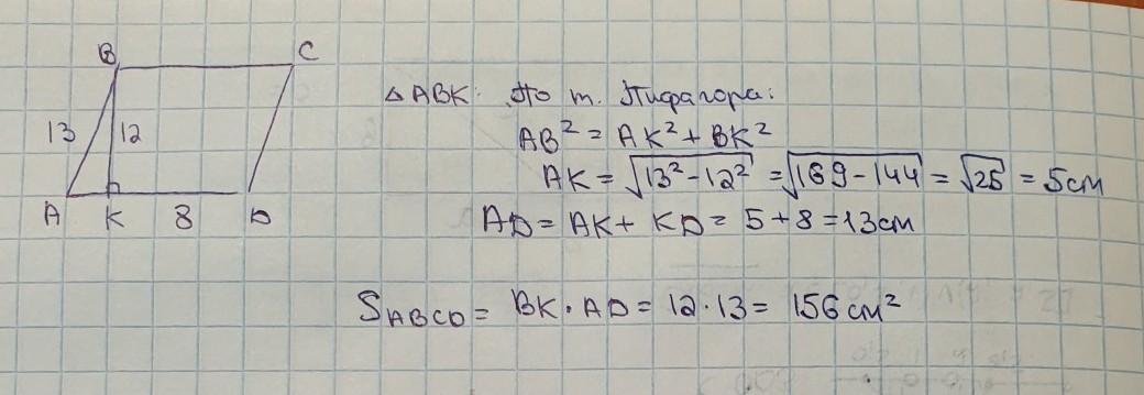 в параллелограмме авсд: вк высота проведенная к стороне ад. вк=12см, ав 13см, кд = 8cm. найдите площадь параллелограмм