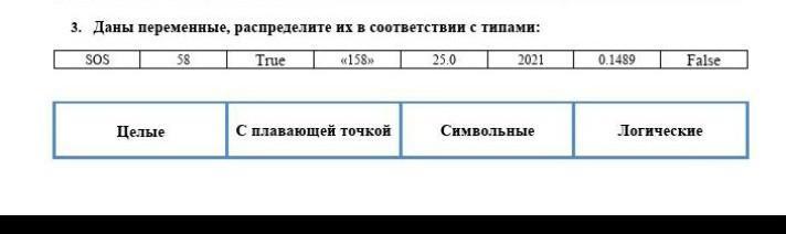 Даны переменные, распределите их в соответствии с типами: