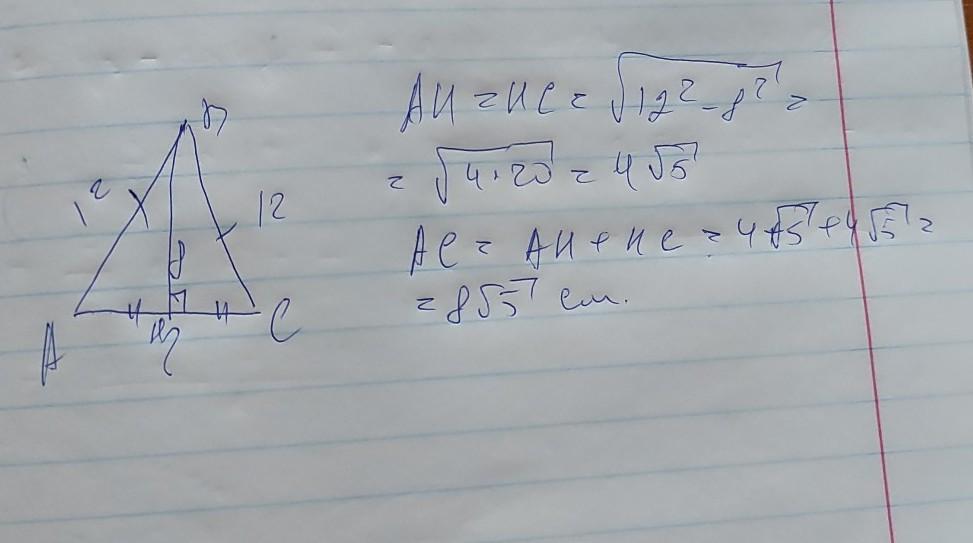 Бічна сторона рівнобедреного трикутника дорівнює 12 см, а висота проведена до основи - 8см. Знайти основу рівнобедреного трикутника