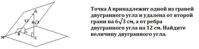 Точка A принадлежит одной из граней двугранного угла и удалена от второй грани на 6√3 см, а от ребра двугранного угла на 12 см. Найдите величину двугранного угла.