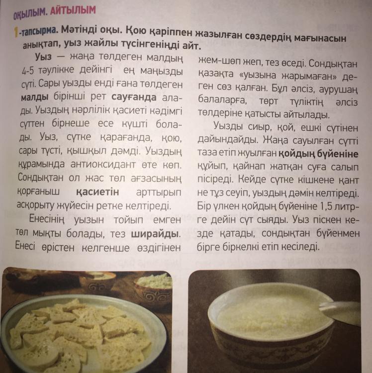 1-тапсырма.Мәтінді оқы.Қою қаріппен жазылған сөздердің мағынасын анықтап,уыз жайлы түсінгеніңді айт
