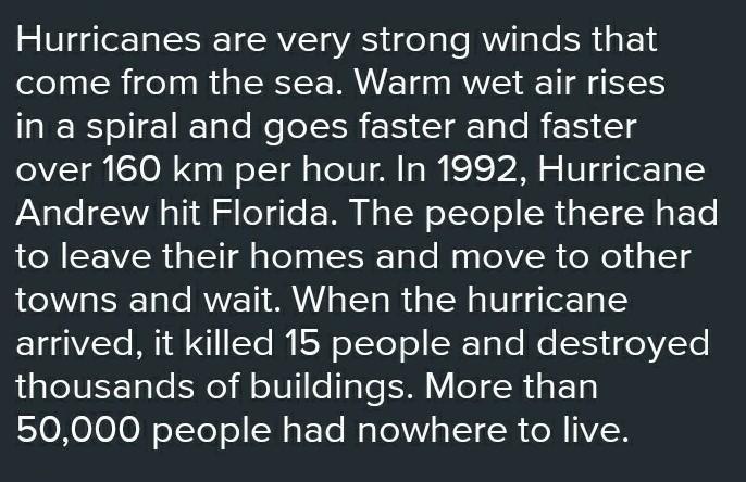 Hurricanes are very strong ______ that come from the sea. Warm wet air rises in a spiral and goes faster and faster - over 160 km an ______. In 1992, “Hurricane Andrew”_____Florida. The people there had to _____their homes and move to other towns and wait. When the______arrived, it killed 15 people and_______thousands and thousands of buildings. More than 50,000 people had nowhere to live.