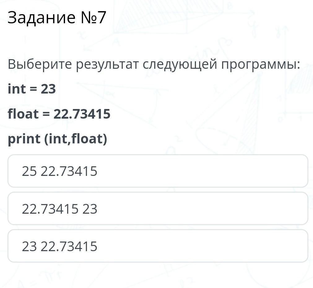 Выберите результат следующей программы: int %3D 23 float %3D 22.7З415 print (int,float) 25 22.73415 22.73415 23 23 22.73415